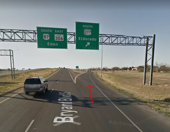 To get there from town, head south on Bryant / US Hwy 87 / Loop 306, and then take the South 277 / Eldorado exit.